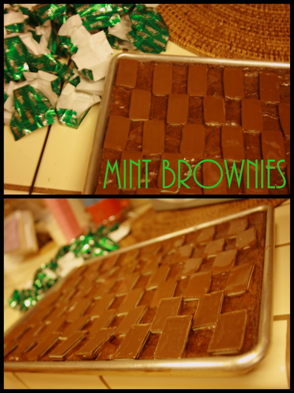 2. Lay one bag of unwrapped Andes Mints in a checkered fashion over still hot brownies